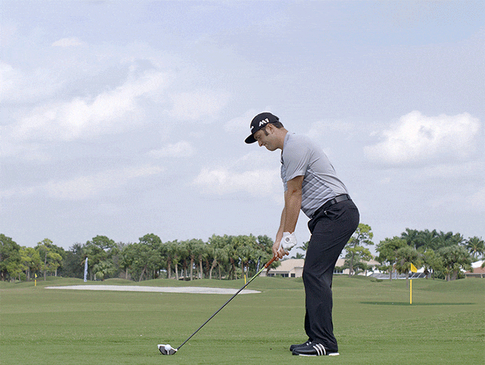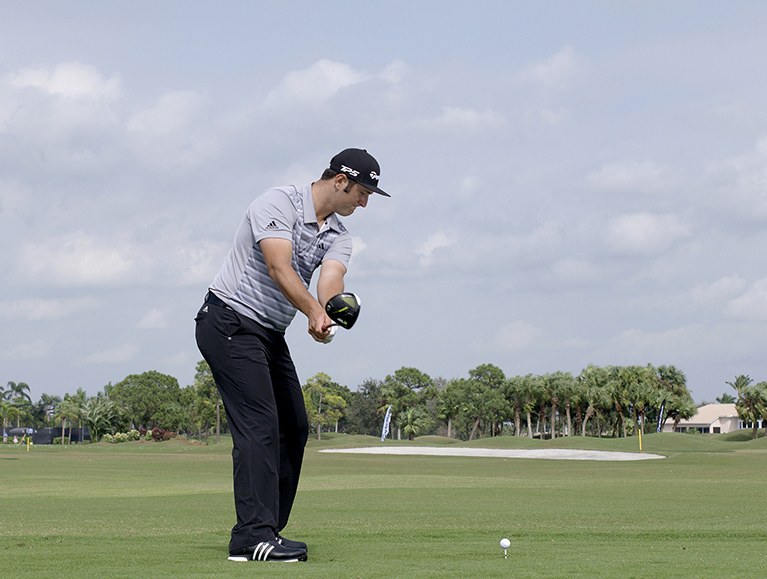 拉姆持續轉動身體通過擊球區。許多業餘球友恰好相反,他們的身體停止轉動,單純揮動雙臂擊球。「我的要領在於持續轉動肩膀,保持球桿在身體前方,」拉姆說。「只要能做到這一點,就能夠紮實擊球。」