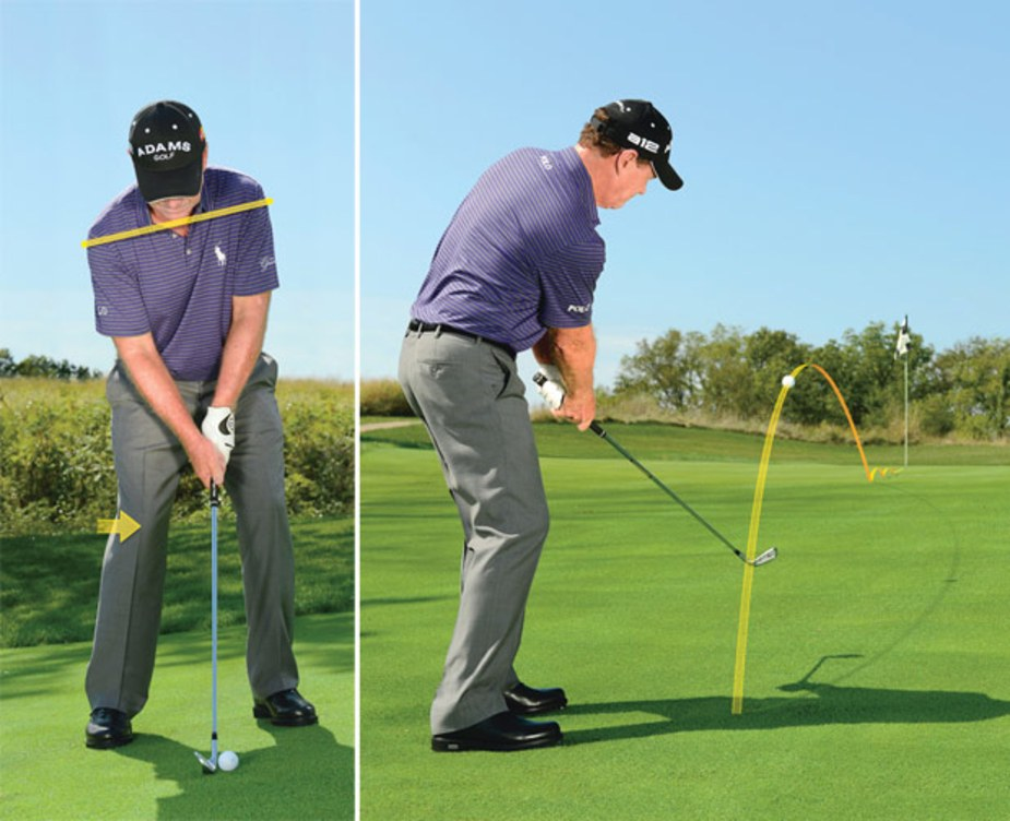 不要企圖讓球直接飛至球洞,應該打近距離起撲球至果嶺前方,然後一路滾向球洞(右上圖)。設定右肩略微低於左肩,方便順著斜坡揮桿,以免球桿挖入草皮中。保持右膝蓋略微向內關,有助於將重量移至左側(左上圖)。如果重心因為斜坡而留在後腳,就很容易出現厚擊或薄擊。
