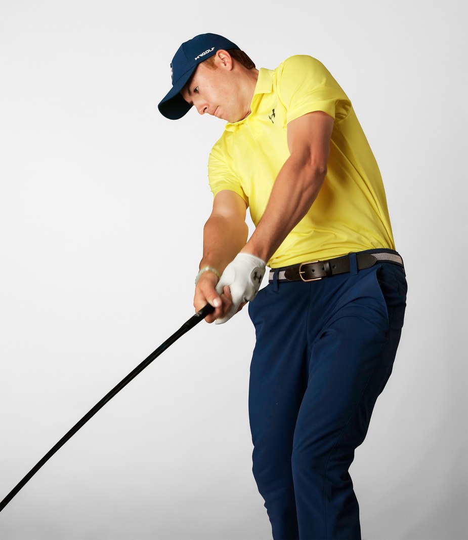 當我感到疲憊的時候,右臀部就容易在起桿時朝目標反方向側移,揮桿隨之失序。上圖是理想的上桿姿勢,我的右臀部是轉動,而不是側移,上桿過程中感覺上半身抵住下半身轉動。由於你看不到我的右臂,表示我已完全轉動肩膀。所以教練卡麥隆.麥柯馬克經常告誡我:「喬丹,藏起你的右臂。」不過我在上桿過程中不太關注右臂或上半身,因為只要感覺右臀部動起來,上半身自然而然會隨之轉動至理想上桿頂點位置。就連老虎都很認同這個上桿要領。