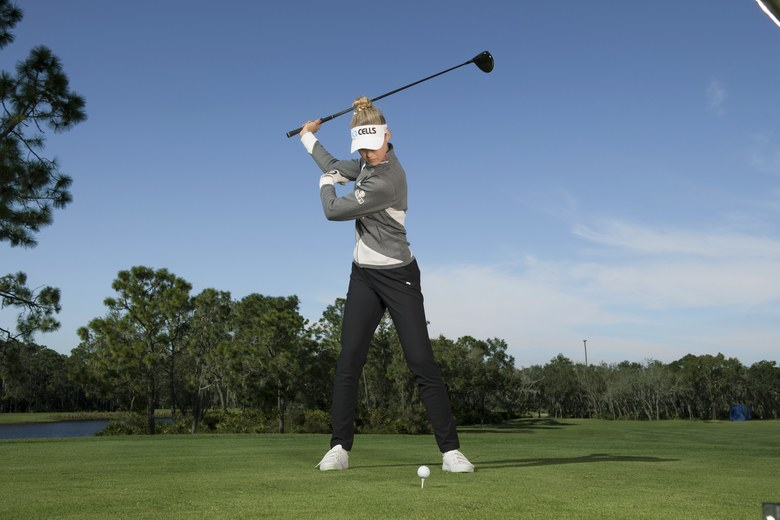為了促成自目標線內側下桿,你應該設定肩膀對向目標線右側,臀部和雙腳仍正對目標線。然後順著肩膀線揮桿,自然可以打出小左曲球。請記住,架球高度以不超出半個球體高於1號木桿頂端為宜。架球過高容易打出高飛球,損失擊球距離。