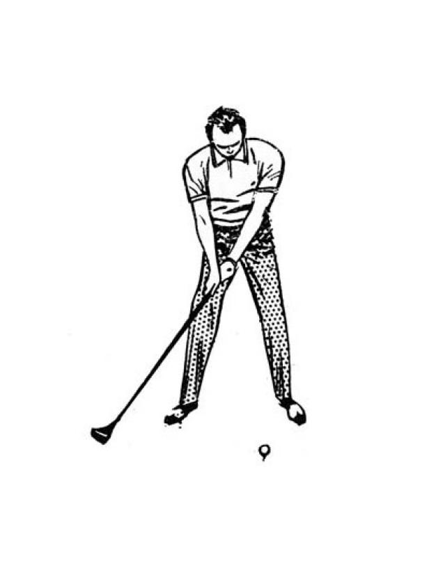 1號木桿的站位約莫與肩同寬,但是並非垂直肩膀。右肩外側的垂直線會碰觸右腳跟內側的地面。左肩外側的垂直線則會碰觸左腳跟的中心點。