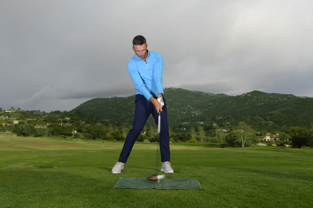 如果移動小白球後方的毛巾,通常意味著你企圖向上擊球,但是重心並未移至前腳。開始下桿時前腳用力推入地面,有助於營造理想的擊球角度。