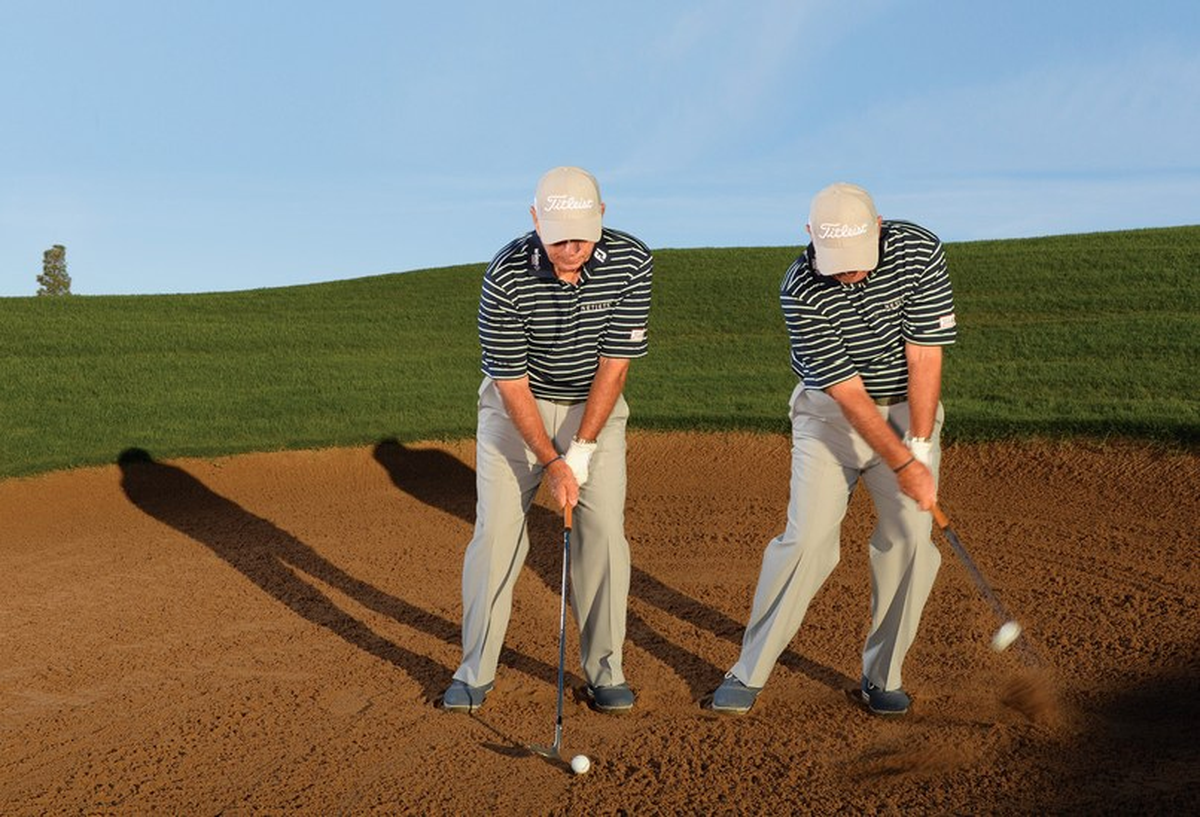 正確的做法是設定球位正對前腳內側。握桿前先設定桿面開放,暴露出沙坑挖起桿底部的反彈角,幫助球桿滑過沙子。設定球位前移,即可用正常揮桿方式打在球後兩、三英寸之處,桿頭越過雙手通過擊球區。只要設定正確,一切都會自然發生,這是提升沙坑擊球績效最有效的方法。