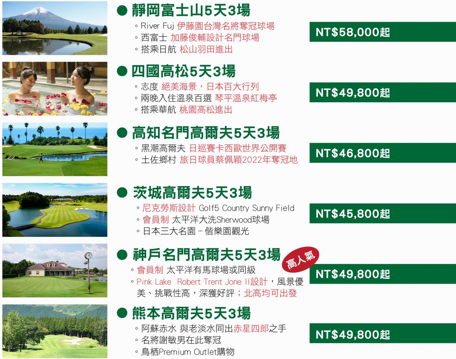 迎接這波出國打球熱潮,操作日本高爾夫多年的富士雲旅遊一口氣推出多個物超所值的日本高爾夫行程,讓大家可用最經濟的花費體驗日本各地不同的高爾夫風情,豐富自己的高爾夫出國經驗。富士雲有一的操作模式