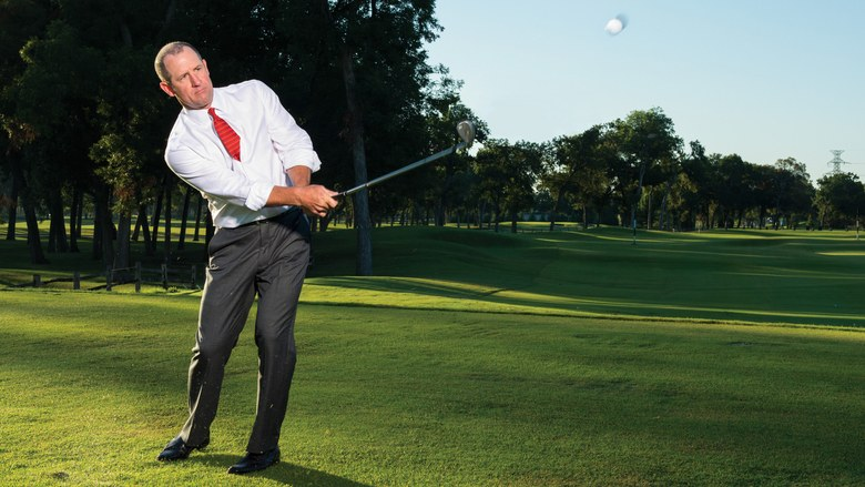 一切都是為了在有限的練習時間內獲得最大效果。首先,與其練習一托拉庫果嶺旁短打,不如選一支挖起桿,例如56度挖起桿,熟練一種基本打法,讓桿身在擊球時回復瞄球時所設定的位置。我就是以此方法教導企業主管法蘭克‧沃格特(左圖)改善差點8的實力。重心應偏向前腳,讓球桿底部滑過球下的草皮。你可以將球位前後調整,即可變化各種彈道,打出各種球路。